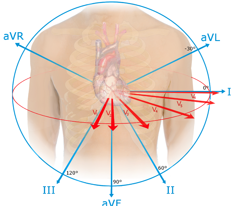 The 12 leads and directions from which an ECG measures the electrical activity of the heart. Lead I, II, and III are the limb leads and are present in the simplest ECG. The augmented limb leads aVF, aVL, and aVR are calculated. A 12-lead ECG additionally records the red vectors. (Source: Wikipedia)
