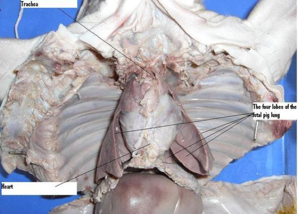 The thoracic cavity is protected by the rib cage and contains the pleural cavity containing the lungs as well as the mediastinum containing the heart. Note the 4 lobes of the lungs and how they hang relatively loose in the pleural cavity, mostly attached by the primary bronchi. As we are dissecting fetal pigs, the lungs were never inflated and are thus not fully developed.